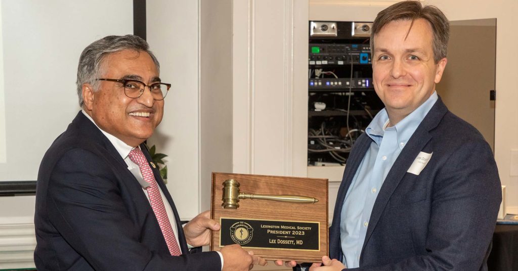 Lee Dossett, MD, CMO Baptist Health Lexington, accepts president’s gavel from Khalil Rahman, MD LEXINGTON On January 24, 2023, Lee Dossett, MD, hospitalist and CMO